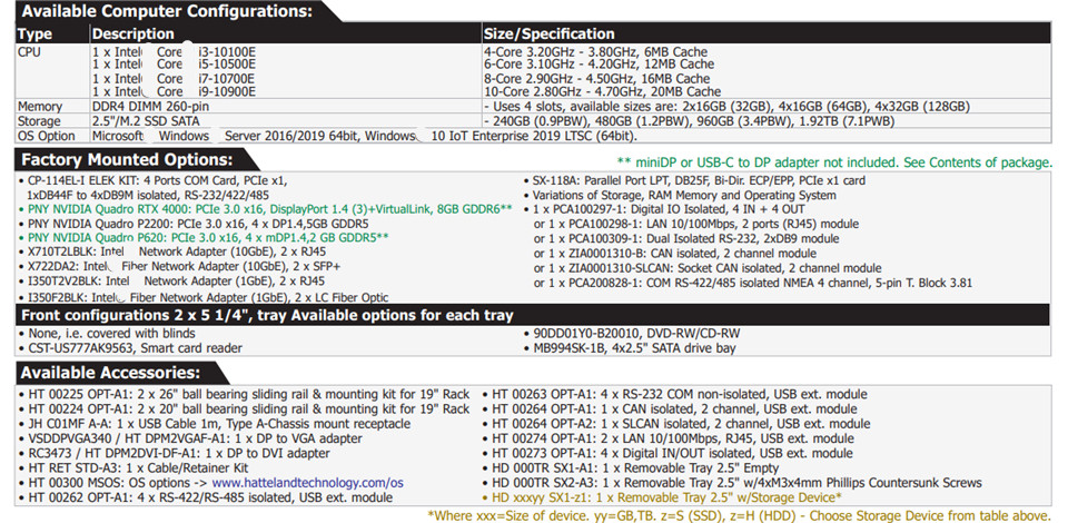 hts31470 3u 系列经工业和船舶认证的 19" 机架式计算机采用新的第 10 代架构设计。种类繁多的 i/o,例如 nmea 0183 端口、串行接口、usb、千兆以太网端口、用于扩展的 pcie 插槽、nvidia 显卡 , 将满足广泛的工业和海事应用。坚固耐用,可用于大多数关键和恶劣的安装。