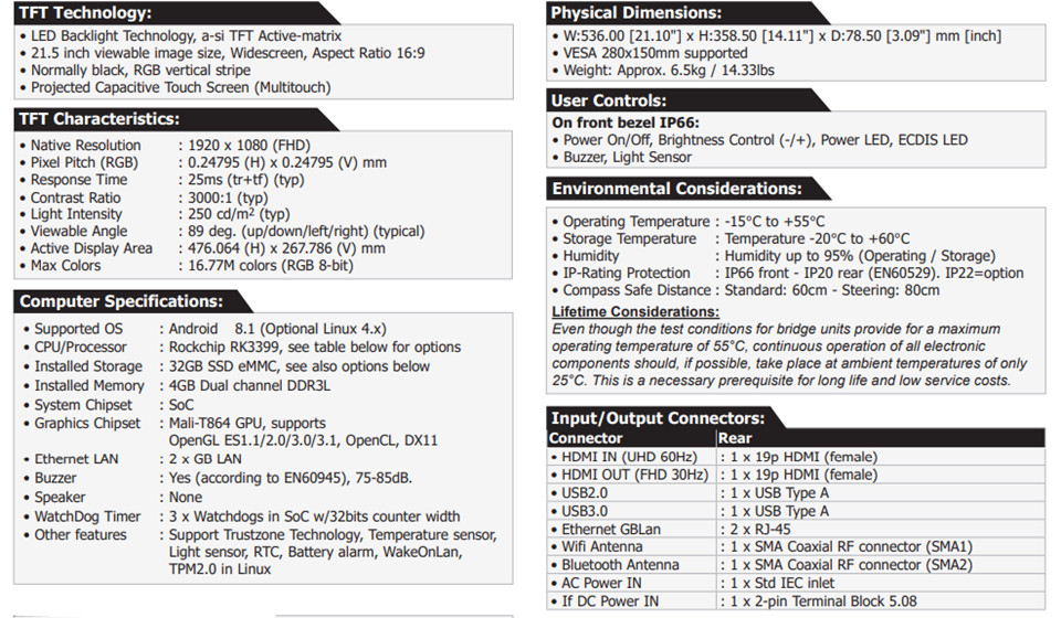 此外,还有工厂安装的投射电容式触摸屏(多点触控、usb 接口)、光学键合、cpu 变体、存储设备、操作系统等选项,并为 wifi 和蓝牙天线做好了准备。默认情况下,该装置符合 ecdis 标准。