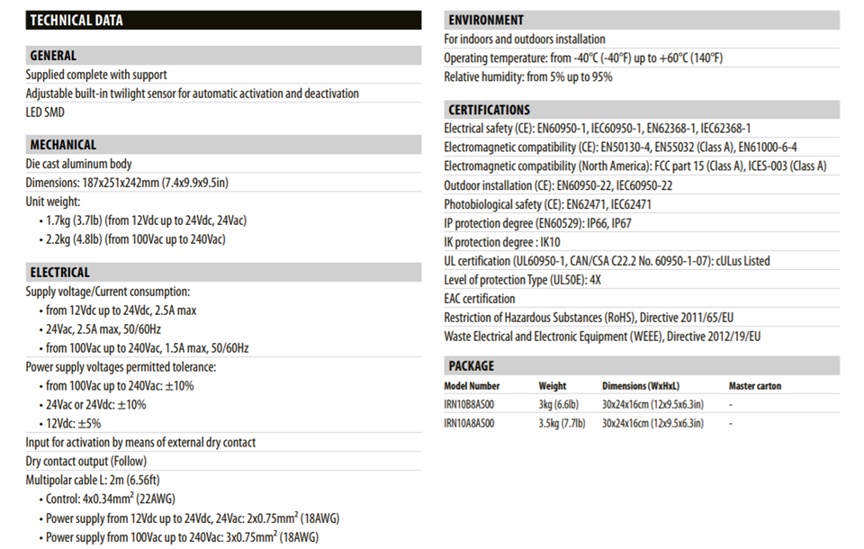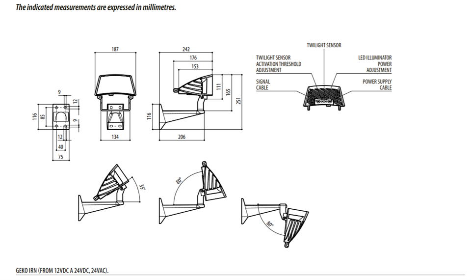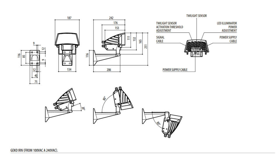 geko 均匀照亮整个场景,消除热点和曝光不足,提供夜间图像和对该区域的安全监控。散热器主体确保led 耐用性和过热保护,而由特殊技术聚合物制成的前玻璃提供高红外透射率。照明器受到静电放电保护。照明器有 24vac/12-24vdc 或 100-240vac 版本,带集成电源。geko 配有一个可水平和垂直旋转的壁挂式支架。geko 红外照明器的保修期为 5 年,而带有白光的 geko 为 2 年。