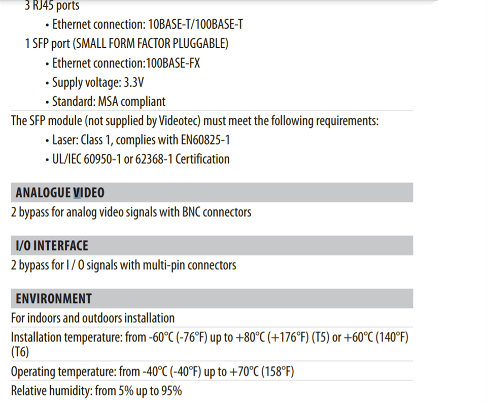 用于光纤连接的 sfp 端口。 sfp模块的类型可以根据安装要求进行选择。内部空间的设计使电缆更容易接入,并在连接过程中增加用户友好性。内部板还提供模拟视频信号的旁路以及 videotec maximus 产品中存在的所有输入和输出。