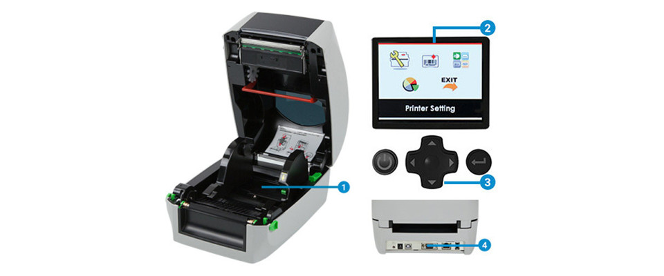 能大幅度地打开机身更换碳带及标签 1。 可使用校准按键快速调整来适应不同材质的标签。